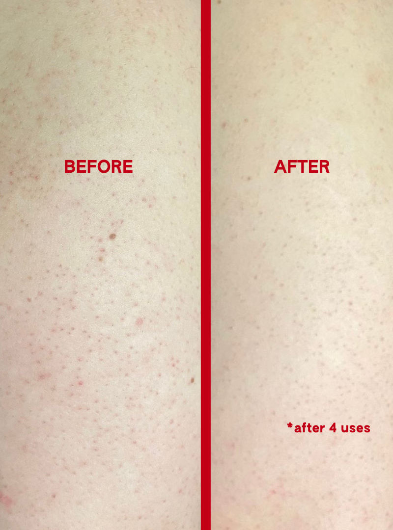 It's tempting to want to try to scrub away for your KP but harsh physical scrubs only aggravate your skin. Chemical exfoliants are more effective way to treat KP by gently exfoliating and smoothing without damaging and irritating your body!
